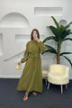 Belden Büzgülü Fermuar Detay Elbise Yağ Yeşili 2889-YAGYESILI